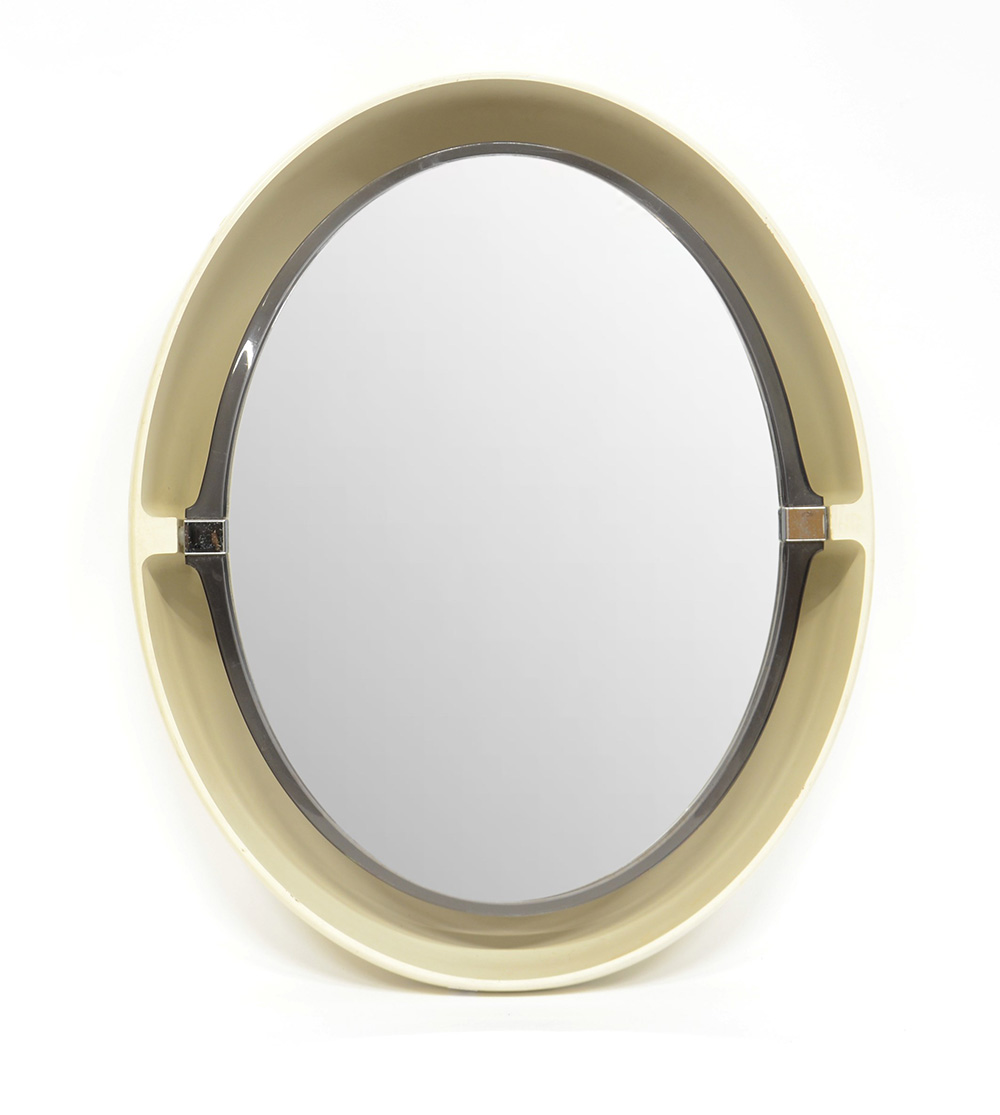 Specchio ovale girevole retroilluminato con struttura in plastica bianca. Italia, anni 70 (cm 68x55) (difetti)