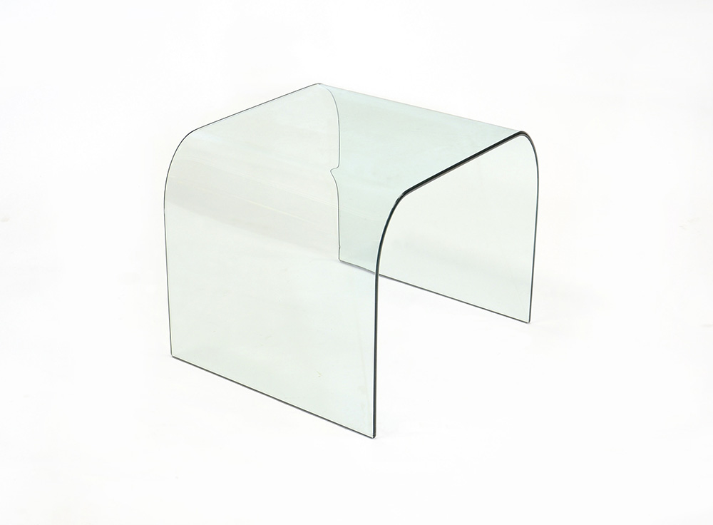 Tavolino in vetro temperato curvato. Produzione italiana, anni 80-90 (cm 56x45x50)