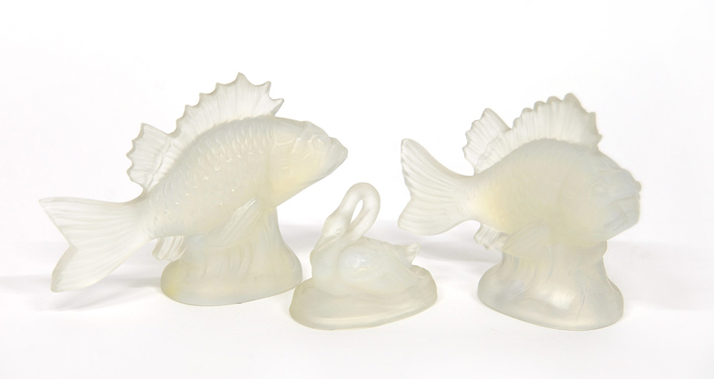 Verlys Lotto composto da due pesci e un cigno in vetro opalescente soffiato in stampo. Rouan, Francia, anni 30. Firmati "Verlys" (hmax cm 11,5) (difetti)