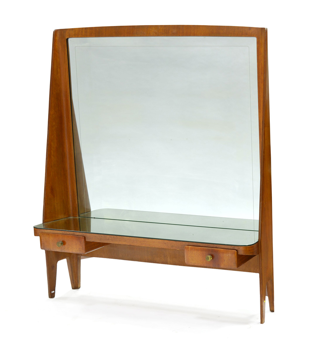 Mobile toeletta in legno impiallacciato con piano e alzata a specchio sottopiano. Esecuzione italiana, anni 60 (cm 140x170x36) (lievi difetti)