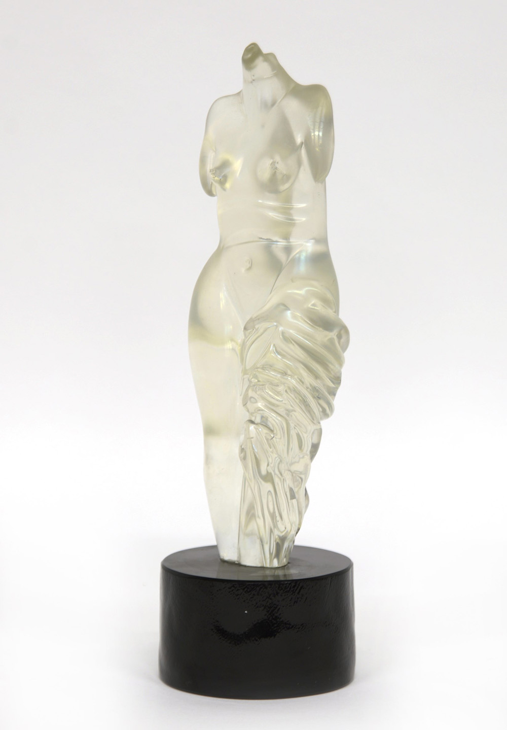 Silvano Signoretto Scultura in vetro massello incolore opalescente e leggermente iridato raffigurante torso di donna. Firmata a punta sotto la base "Signoretto Silvano". Murano, Anni 90 (h cm 41)