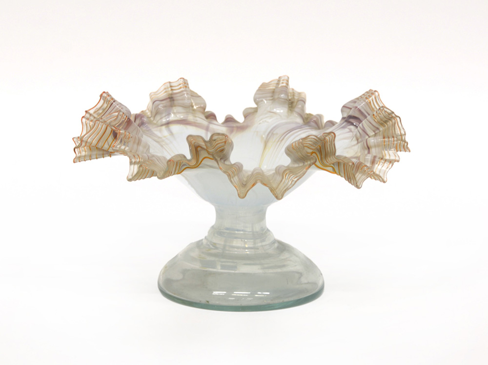 Manifattura di Murano. Alzatina in vetro soffiato incolore e marmorizzato con bordo frastagliato. Sec XX (d cm 30, h cm 17)