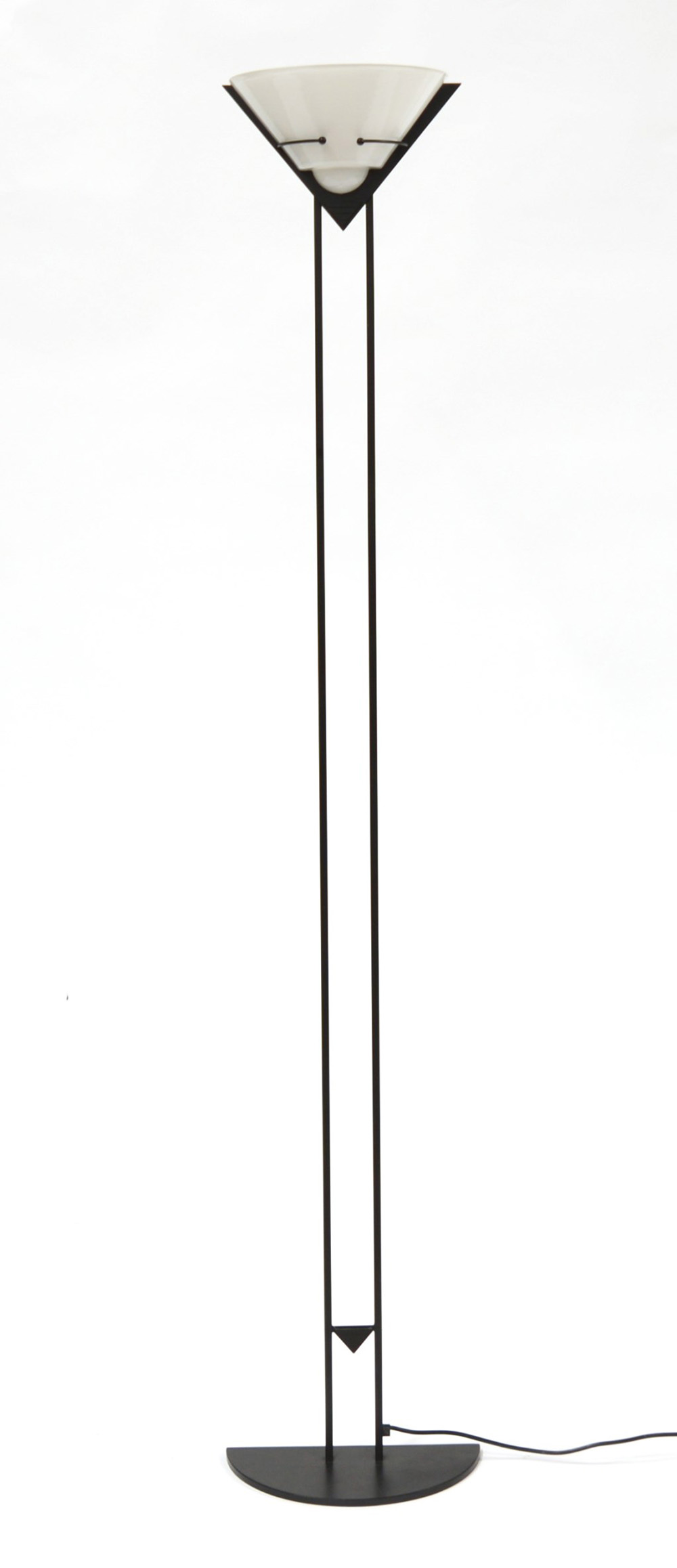 Lampada da terra alogena con struttura in metallo laccato nero e diffusore in vetro incamiciato lattimo. Italia, anni 80 (h cm 180,5) (lievi difetti)