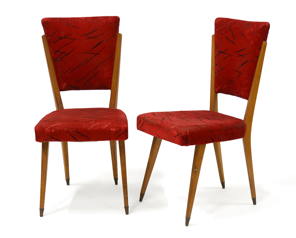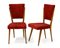Coppia di sedie in legno massello chiaro con seduta e schienale imbottiti rivestiti in tessuto rosso. Italia, anni 50 (cm 42x88x45) (difetti)