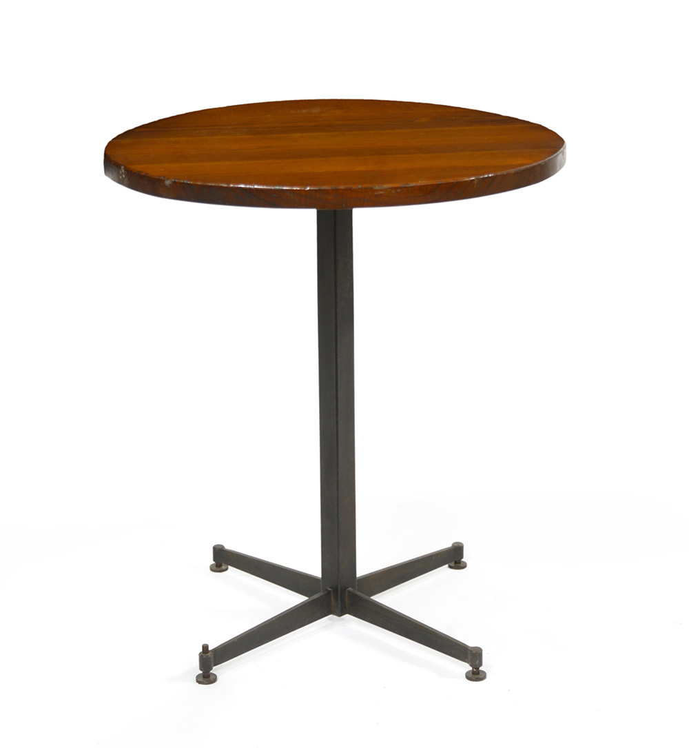 Tavolino da appoggio con piano tondo in legno massello, gamba centrale e piedi in ferro verniciato nero. Italia, anni 60 (d cm 64, h cm 73) (difetti)