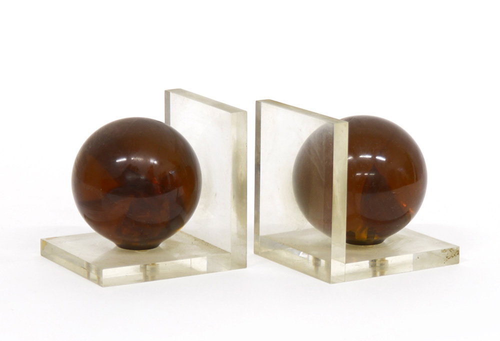 Coppia di fermalibri in plexiglass incolore e color ambra. Italia, anni 70 (h...