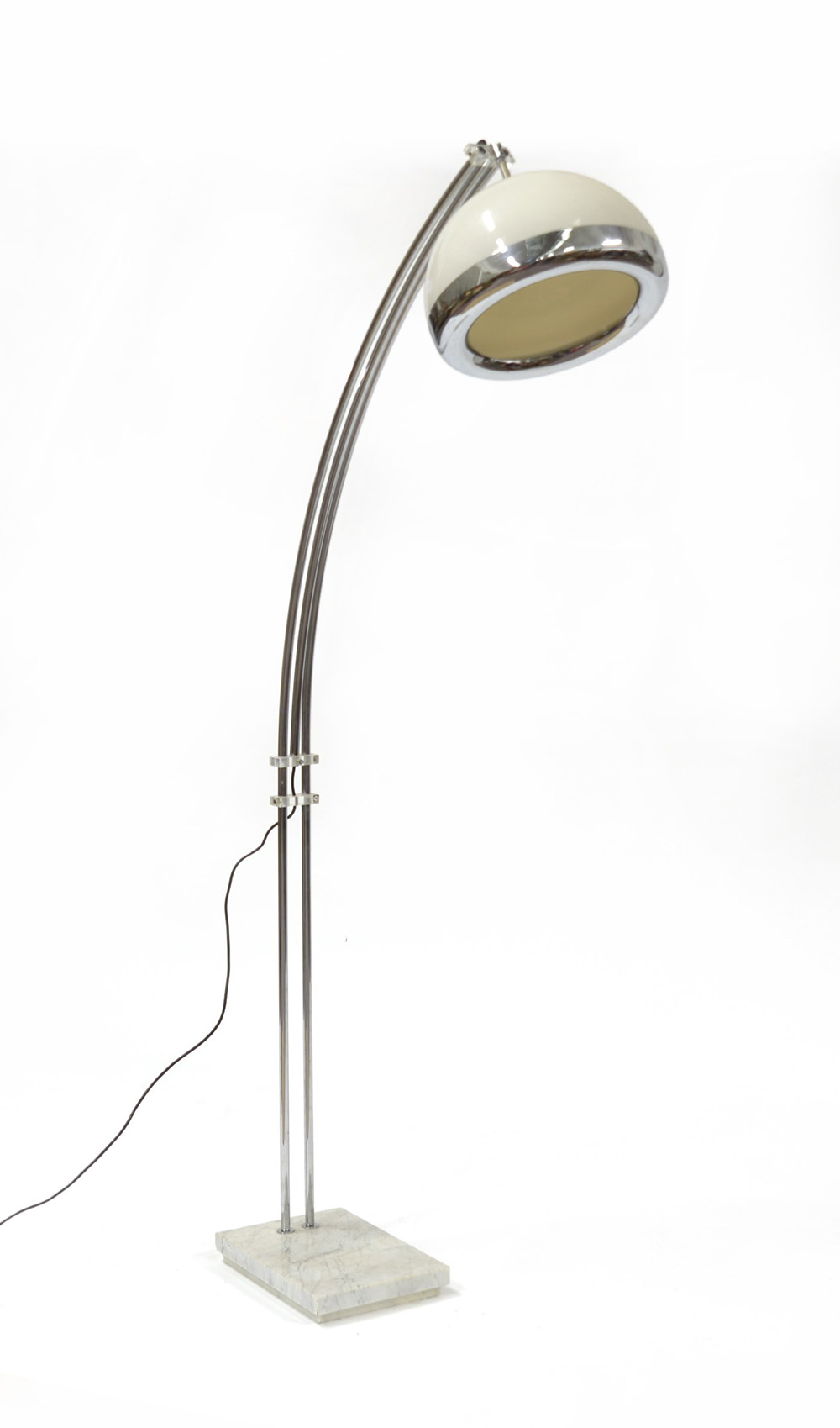 Lampada da terra in metallo cromato e plexiglass con base in marmo di Carrara e paralume in perspex opalino. Italia, anni 70 (h cm 182) (lievi difetti)