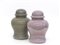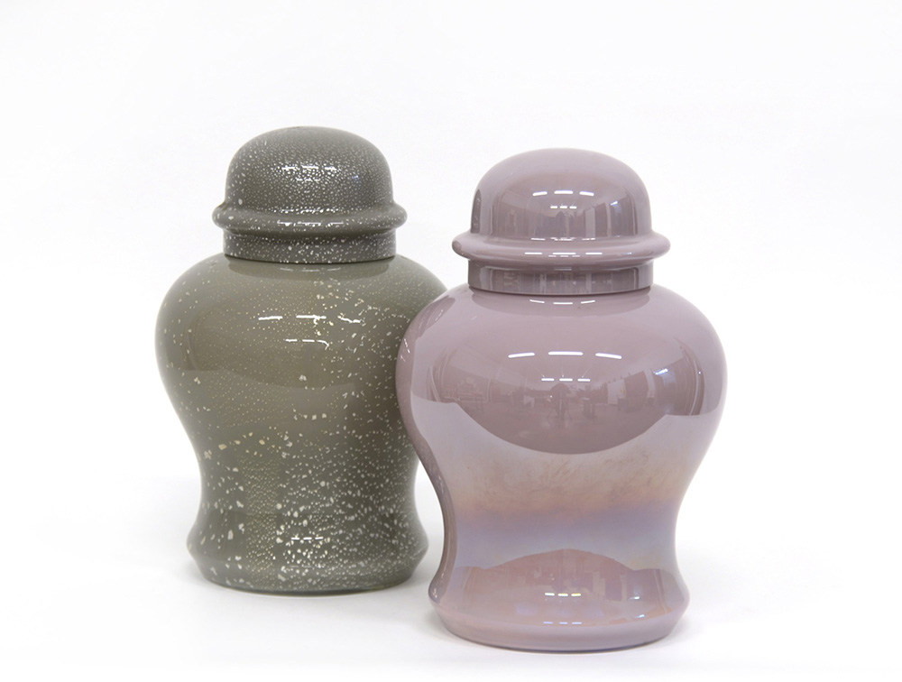 Manifattura di Murano. Lotto di due ciste con coperchio in vetro incamiciato rispettivamente rosa iridato sulla superficie esterna e grigio con inclusione di foglia d’oro. Seconda metà del sec XX (d cm 22, h cm 35) (lievi difetti)