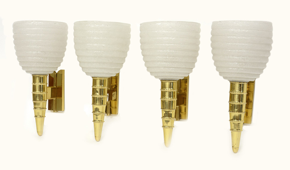 Quattro appliques con struttura in ottone e diffusore a coppa in vetro pulegoso incolore. Italia, produzione recente (h cm 35) (lievi difetti e restauri)