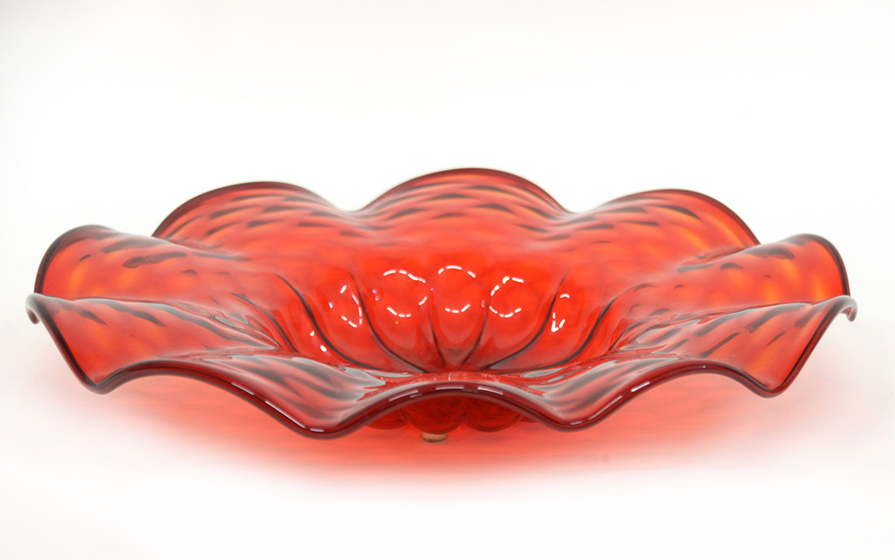 Manifattura di Murano. Centrotavola costolato e lavorato a "balloton" in vetro trasparente rosso. Anni 30/40 (d cm 45) (difetti)