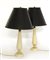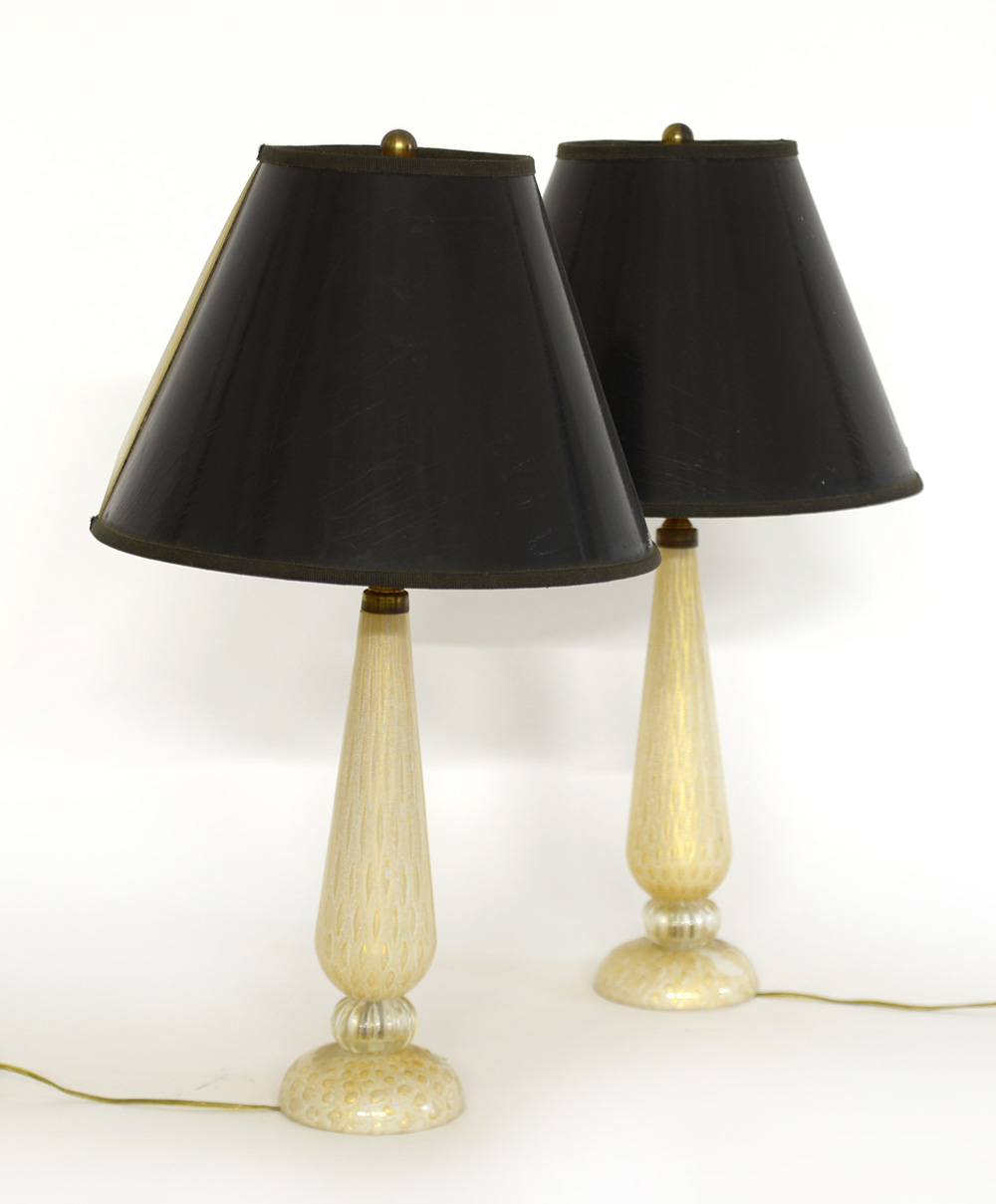 Manifattura di Murano. Coppia di lampade da tavolo in vetro incamiciato a bolle con inclusione di foglia d’oro. Montatura in ottone e paralume in cartone nero. Produzione recente (h cm 54)