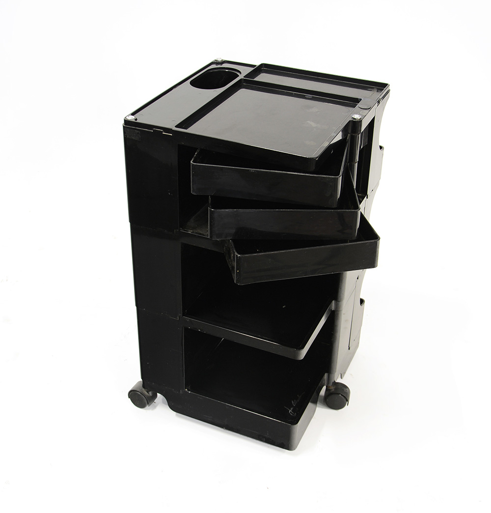 Joe Colombo (Milano 1930 - Milano 1971) Carrello modello "Boby". Produzione Bieffe Plast, Padova, 1970. Plastica nera. Firmato sul ripiano in basso e stampigliato sul fondo (cm 43x73x41) (difetti)
