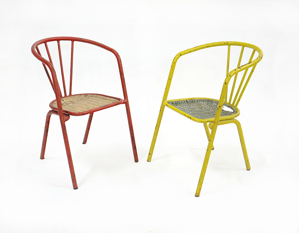 Coppia di poltroncine da giardino in metallo verniciato giallo e rosso (cm 9x74x48) (gravi difetti)