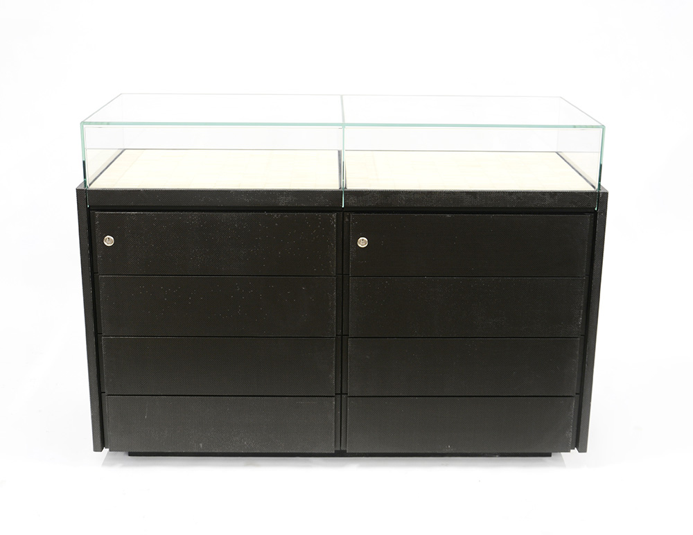 Cassettiera rivestita in materiale plastico nero con elemento di coronamento in cristallo. Italia, produzione recente (cm 127x91,5x50