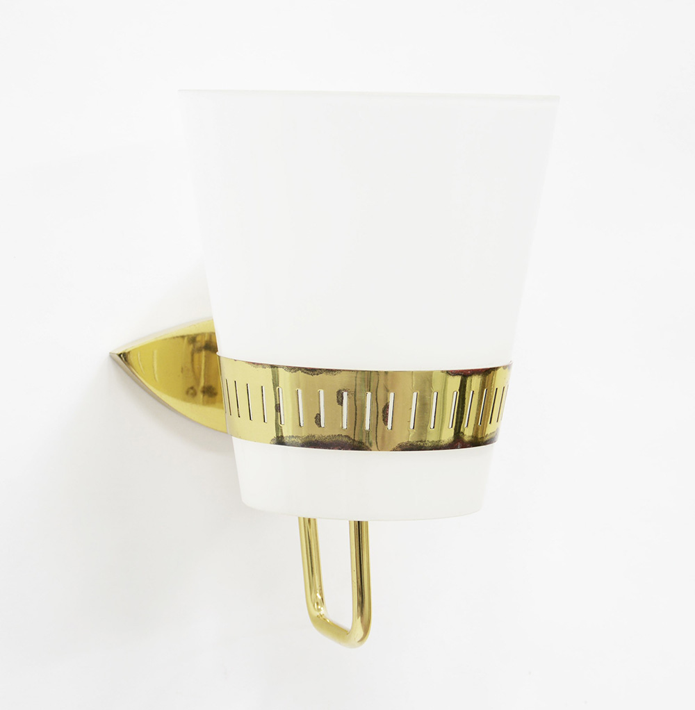 Stilnovo (attribuito) Lampada da parete con struttura in ottone lucidato e diffusore troncoconico in vetro incamiciato lattimo. Milano, anni 60. La struttura è simile ai modelli "2120" e "2078" (h cm 30) Bibliografia: T. Bräuniger, Stilnovo. Apparecchi per l'illuminazione, Luminaires-moderniste, Berlin 2016, pp. 130, 132