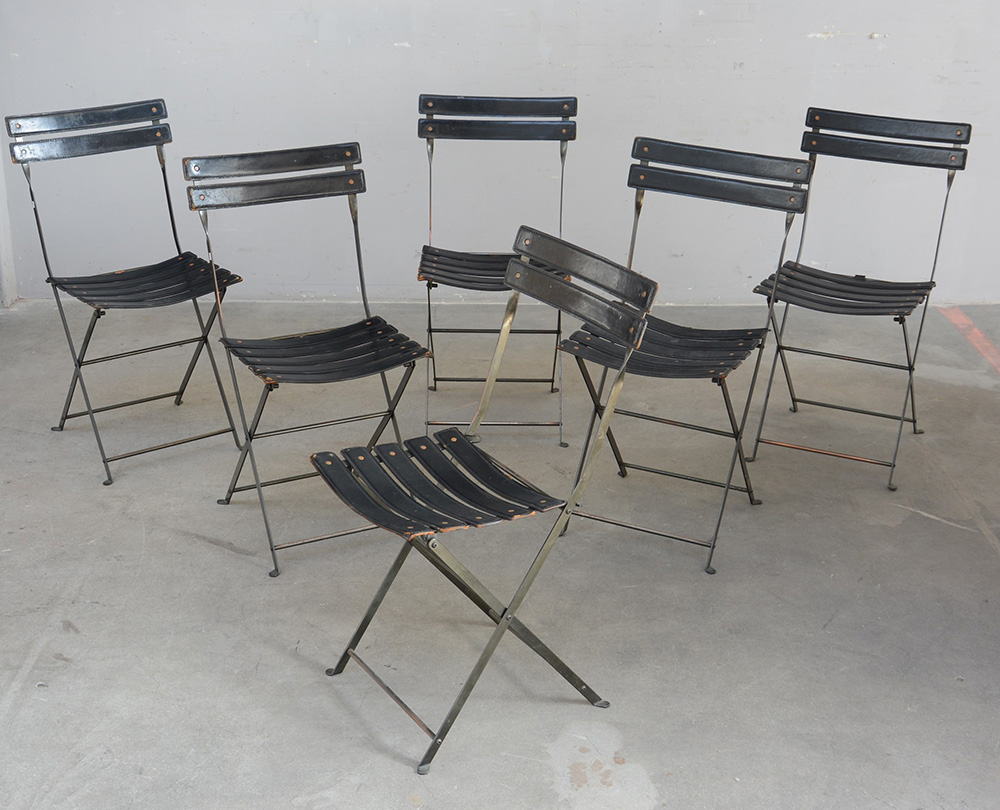 Marco Zanuso (Milano 1916 - Milano 2001) Gruppo di sei sedie pieghevoli modello "Celestina" produzione Zanotta, Milano, 1978. Struttura in acciaio, schienale e sedile a doghe rivestite in cuoio nero (cm 42x82x50) (difetti) Bibliografia: G. Gramigna, Repertorio del design italiano 1950-2000 per l'arredamento domestico, vol 1, Allemandi, Torino 2003, p. 253