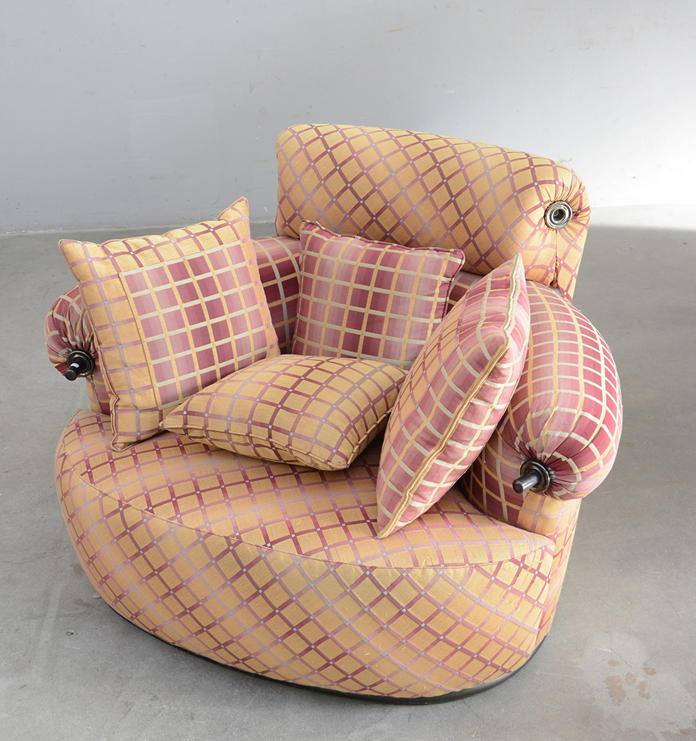Luigi Caccia Dominioni (Milano 1913 - Milano 2016) Poltrona modello "P20B Toro". Produzione Azucena, Milano 1979. Tondino di ferro verniciato e tessuto a quadri nei toni del giallo e del vinaccia (cm 115x80x90) (difetti) Bibliografia: Azucena. Mobili e oggetti, a cura di M. Imparato, F. Radaelli, S. Milesi, Azucena, Milano 2012, pp. 68-69
