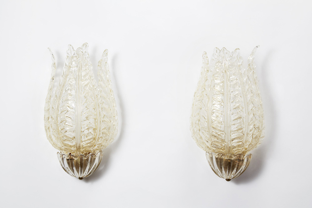 Venini (attribuito) Coppia di appliques a cinque foglie in vetro incolore con inclusione di foglia d'oro. Murano, anni 50 (h cm 52 ca) (lievi difetti) Venini, Murano (attributed) Five leaves pair of appliques. Clear glass with gold leaf inclusion. 1950s (h cm 52 ca) (minor defects)