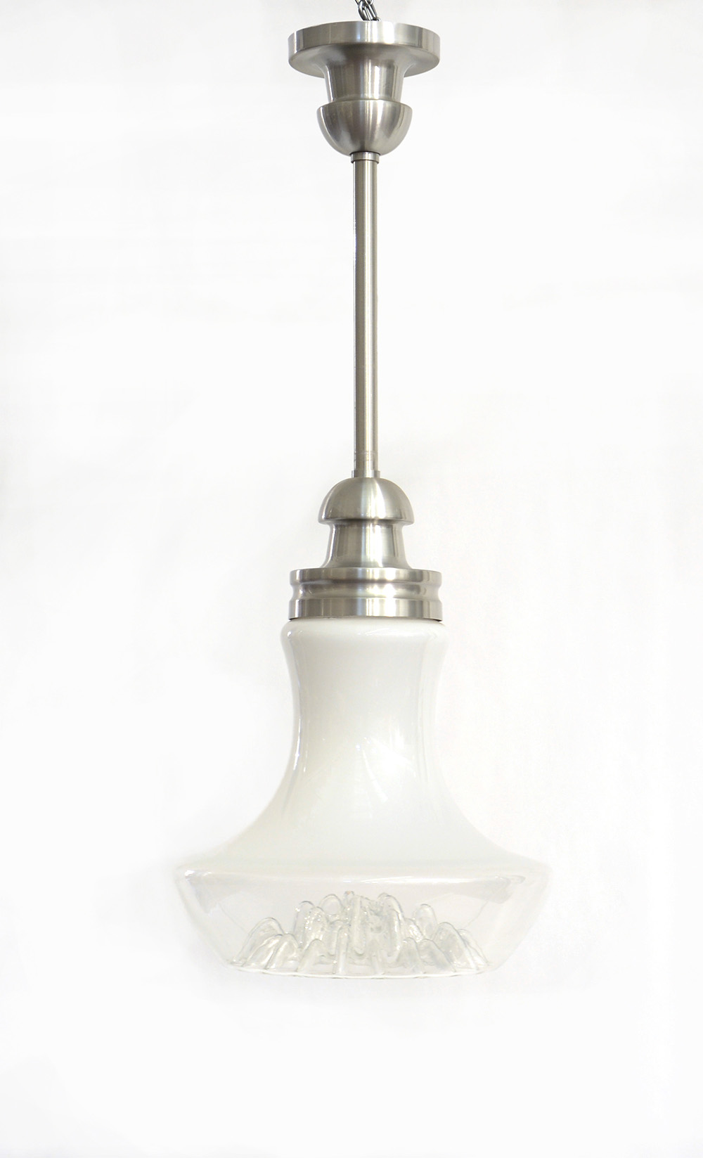 Carlo Nason (attibuito) Lampada a sospensione in alluminio con diffusore in vetro opalescente e lattimo. Probabile produzione Mazzega, Italia, anni 70 (lievi difetti)