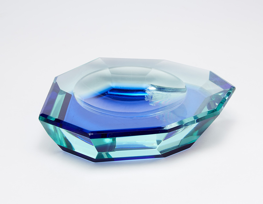 Fontana Arte (attribuito) Posacenere in cristallo molato blu e verdino di forma sfaccettata. Milano anni 50 (l cm 20,5) (lievi difetti)