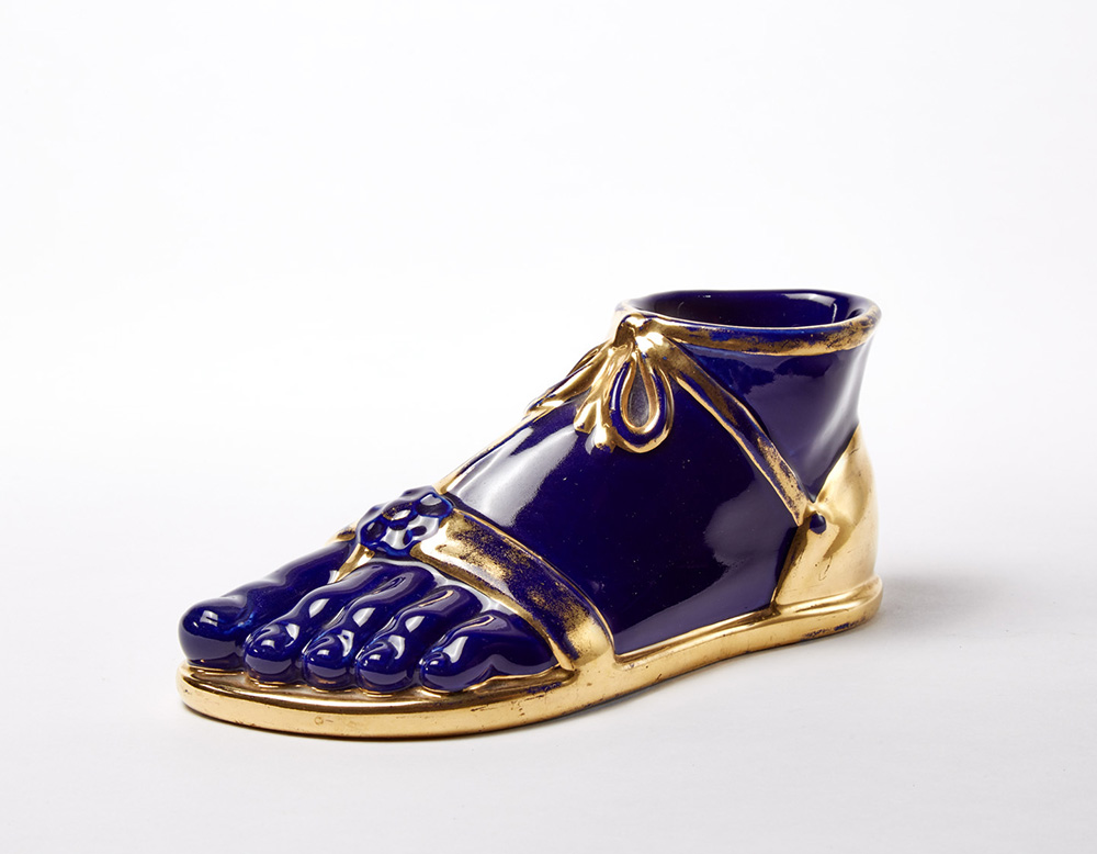 Piero Fornasetti (Milano 1913 - Milano 1988) "Piede" Scultura in ceramica smaltata in blu cobalto e parzialmente dorata raffigurante un piede con calzare. Italia, anni 50 (l cm 23) (lievi difetti)