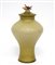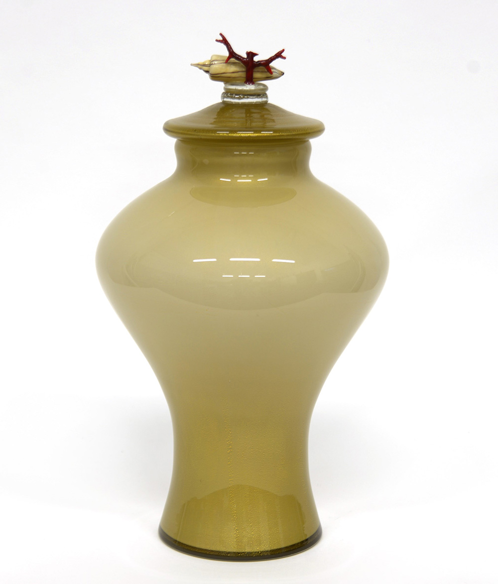 Seguso (attribuito) Grande vaso a balaustro in vetro incamiciato lattimo e pagliesco con applicazione di foglia d'oro. Coperchio decorato con conchiglie e coralli (h cm 45 totale) (difetti e mancanze)