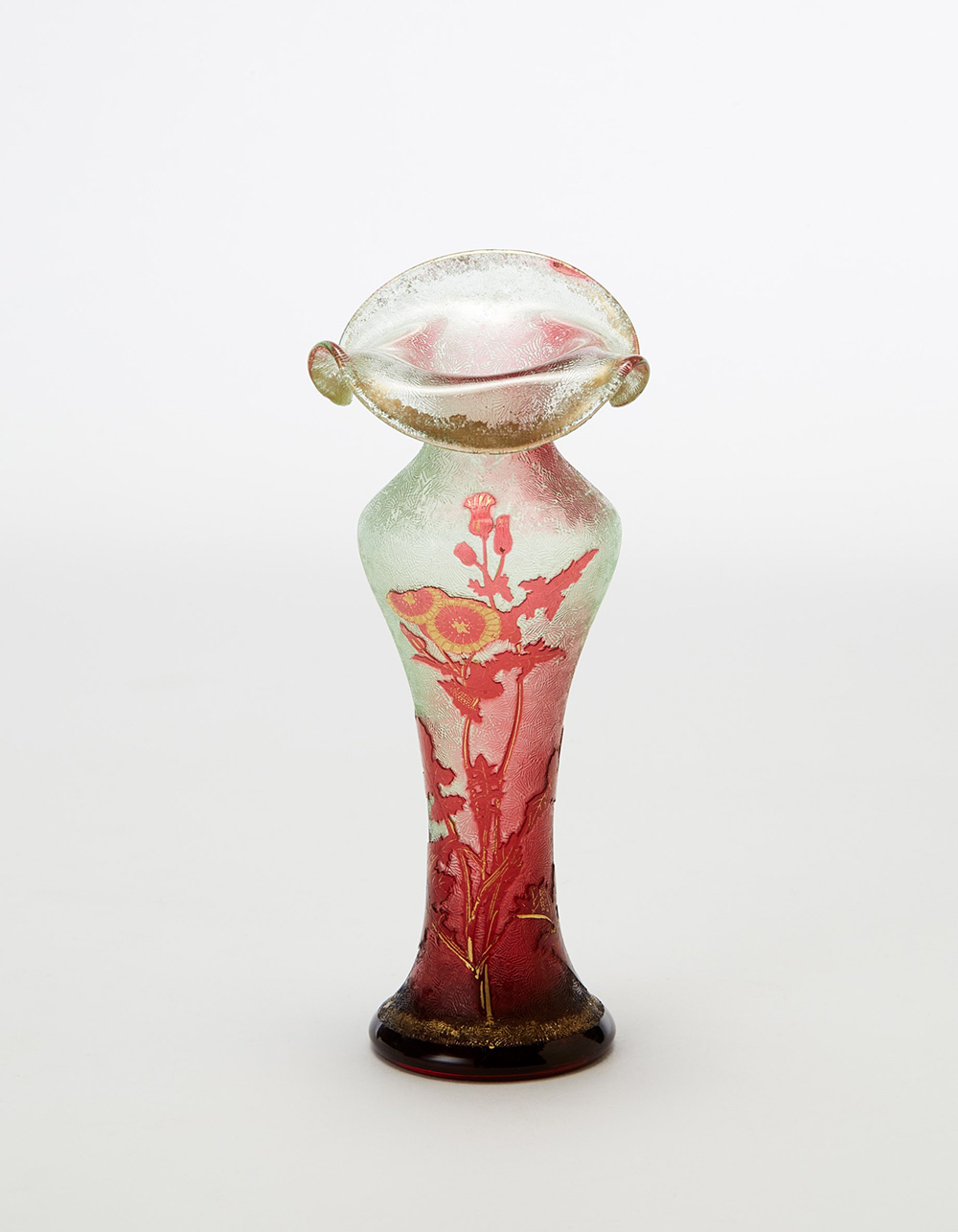 Daum Piccolo vaso in vetro trasparente, vinaccia e verdino corroso e inciso all’acido con decori floreali e applicazioni in oro. Nancy, inizi del sec XX. Firmato a punta sotto la base "Daum Nancy" (h cm 16,5) (lievi difetti)