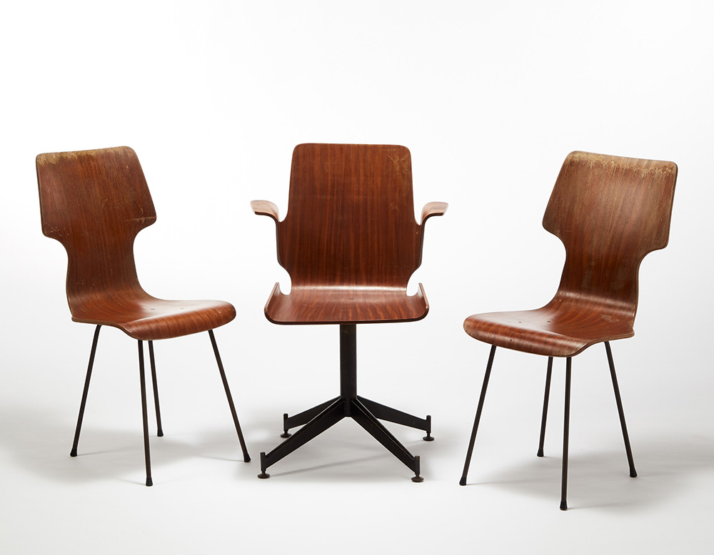 Carlo Ratti Coppia di sedie in compensato curvato e struttura in tubolare metallico, unite a una poltroncina girevole di analoga fattura. Produzione Società Compensati Curvi, Monza, anni 50 (sedie: cm 40x85,5x50, poltroncina: cm 56,5x85,5x50) (difetti) Bibliografia: "Rivista dell'arredamento", n. 25, gennaio 1957, pubblicità