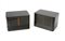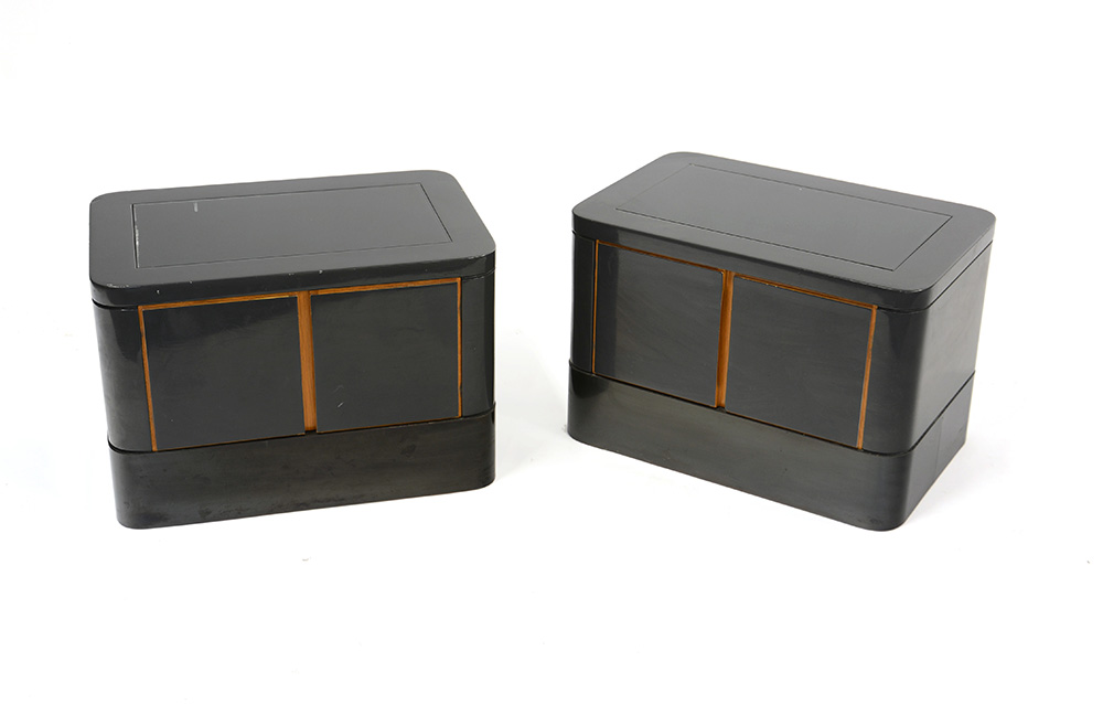 Luigi Caccia Dominioni (Milano 1913 - Milano 2016) Coppia di comodini su misura a due ante in legno laccato grigio con base rivestita in lamina d'acciaio brunito. Produzione Azucena, Milano, anni 70 (cm 60x40x40) (lievi difetti) Provenienza: arredo su misura per una villa sul lago di Garda
