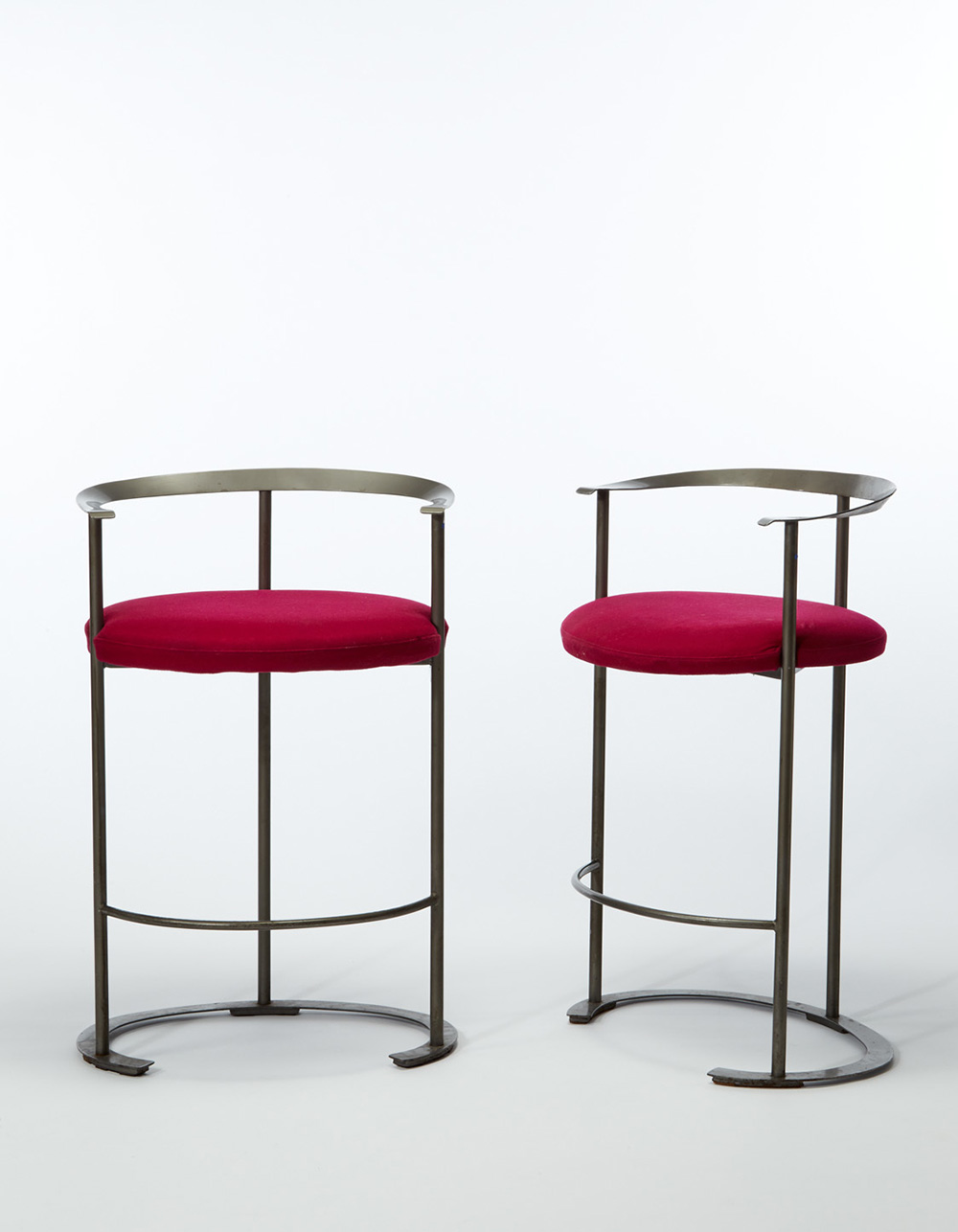 Luigi Caccia Dominioni (Milano 1913 - Milano 2016) Coppia di sedie alte modello "Catilina". Produzione Azucena, Milano, dal 1962. Seduta in panno fucsia e struttura in metallo brunito (cm 56x86,5x46) (lievi difetti)