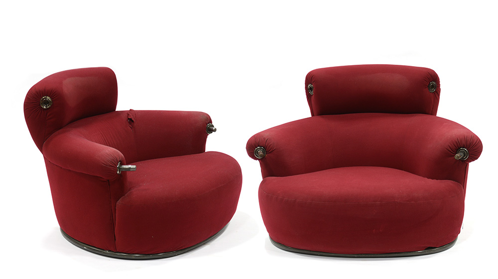 Luigi Caccia Dominioni (Milano 1913 - Milano 2016) Coppia di poltrone modello "P20B Toro". Produzione Azucena, Milano 1979. Tondino di ferro verniciato e velluto bordeaux (cm 115x80x90) (difetti) Bibliografia: Azucena. Mobili e oggetti, a cura di M. Imparato, F. Radaelli, S. Milesi, Azucena, Milano 2012, pp. 68-69