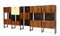 Galleria del Mobilio Credenza a cinque moduli e sei montanti. Desio, 1958 ca. Montanti in massello di palissandro indiano, ripiani e contenitori in paniforte di obece rivestiti in palissanro indiano. Tre stipi a ribalta, tre stipi due stipi ad ante, tre moduli a tre cassetti ciascuno, un contenitore bar rivestito in belle crème. (lievi difetti) Bibliografia: Molti mobili con 7 elementi, in "Rivista dell'arredamento", n. 43, luglio 1958, pp. 18-19