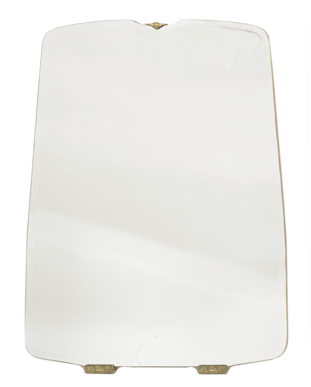 Specchiera in vetro molato di forma stondata con montatura a tre staffe in fusione di bronzo con decori a rilievo. Esecuzione italiana, anni 40 (cm 101x150)