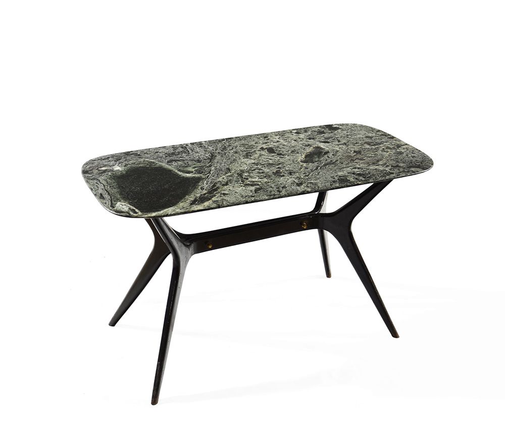 Tavolo da caffè con piano in marmo venato verde e struttura in legno massello ebanizzato a quattro gambe inflesse e rastremate. Italia, anni 50 (cm 90x51,5x45) (lievi difetti)