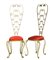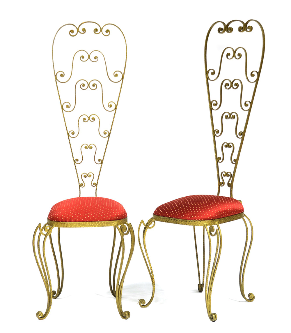 Colli Coppia di sedie da ingresso in ferro battuto, forgiato, martellinato e dorato, seduta rivestita in tessuto rosso. Torino anni 40 (cm 45x136x45) (lievi difetti)