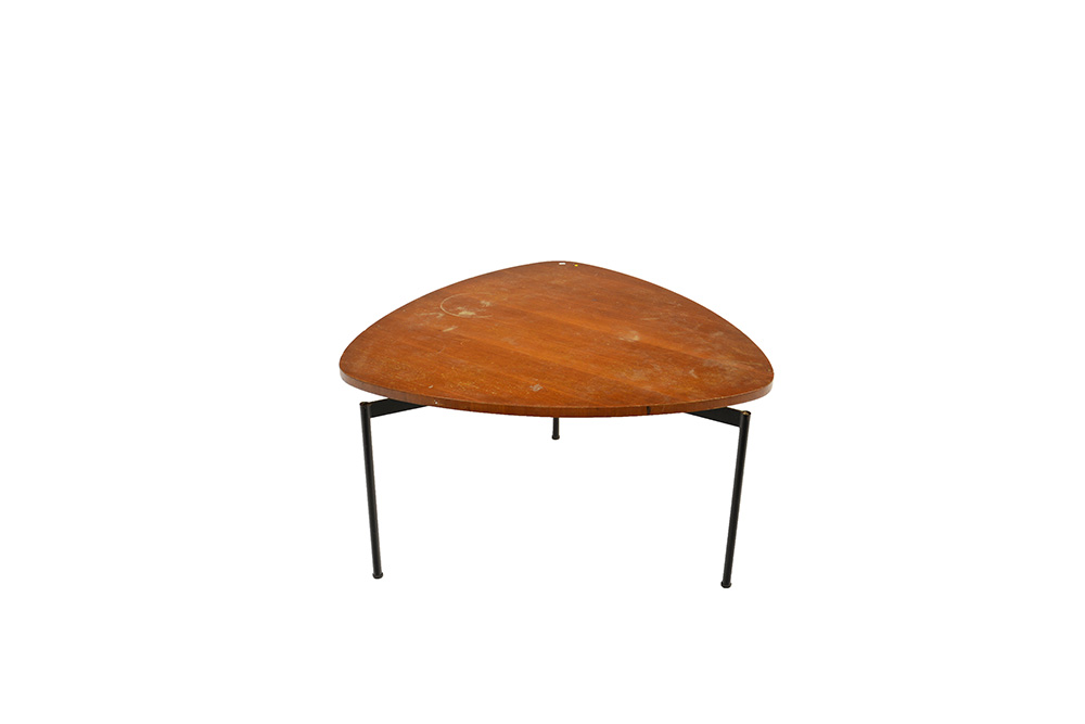 Tavolo basso a tre piedi con struttura in metallo verniciato nero e piano impiallacciato in legno. Italia, anni 60 (d cm 87, h cm 51,5) (difetti)