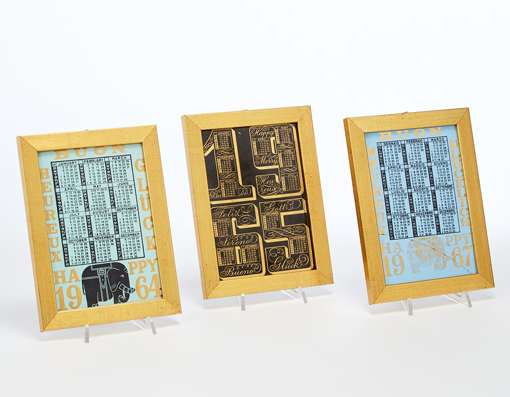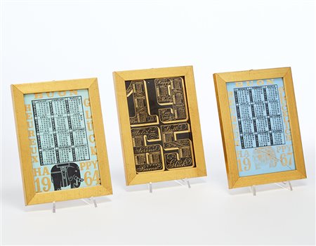 Piero Fornasetti (Milano 1913 - Milano 1988) Lotto composto da tre calendari in ceramica dipinta per gli anni 1964, 1965 e 1967. In cornice dorata (cm 18x12)(difetti)