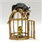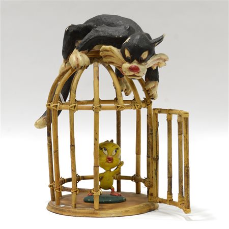 Gatto silvestro e titti. Resina policroma e bambù. Marcati "AAA" e "Made in...