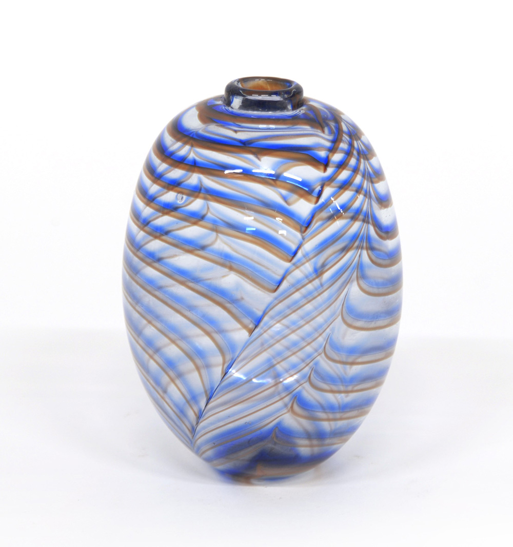 Manifattura di Murano. Vasetto ovoidale a orlo stretto in vetro incamiciato con decoro tipo fenicio a fasce incolore, blu trasparente e cipra opaco. Anni 70 (h cm 15) (difetti)