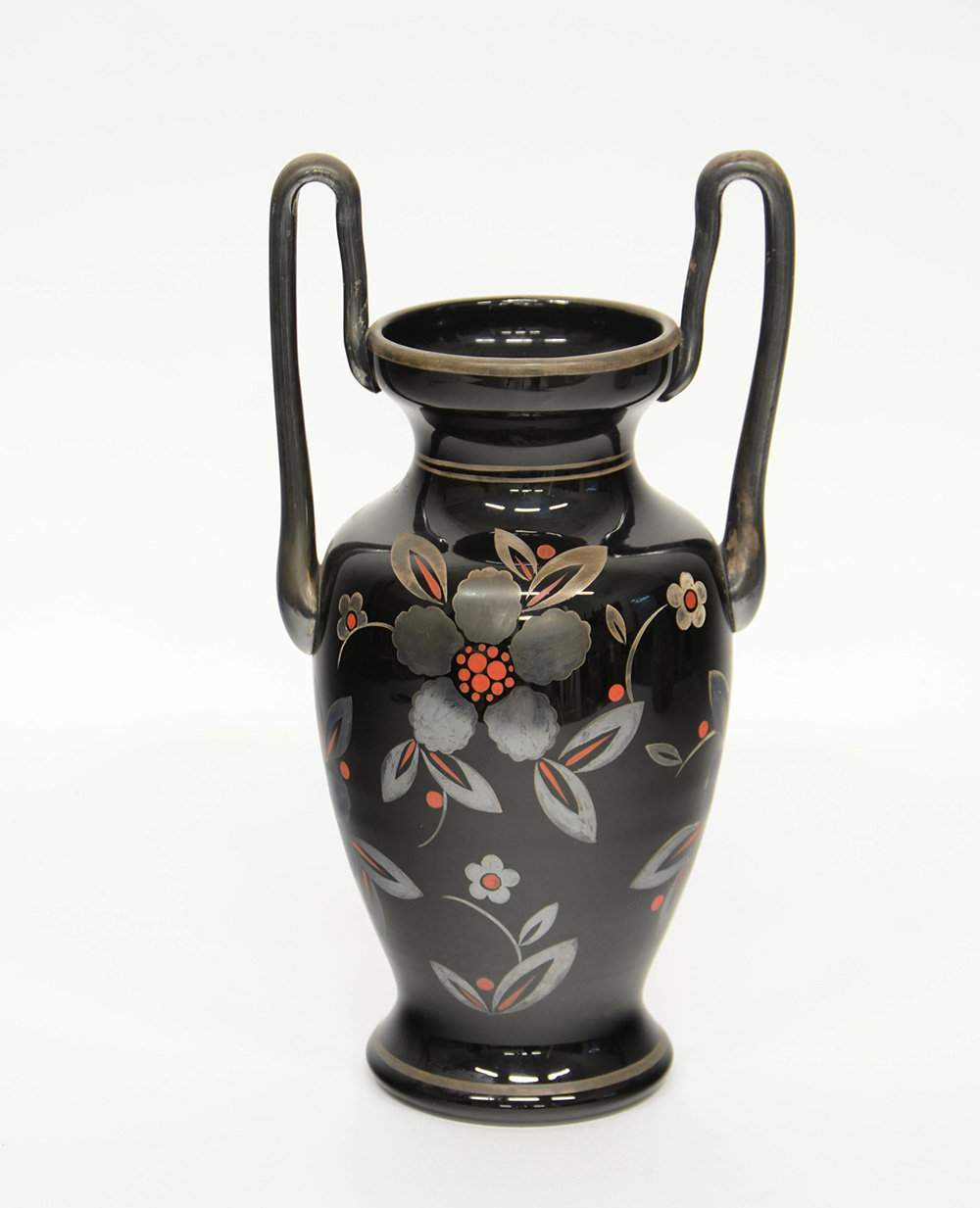 Manifattura europea. Vaso biansato in vetro ametista scuro, decorato a smalto rosso e argento con motivi floreali di gusto Déco. Seconda metà deglia nni 20. (h cm 32,5) (lievi difetti)