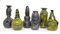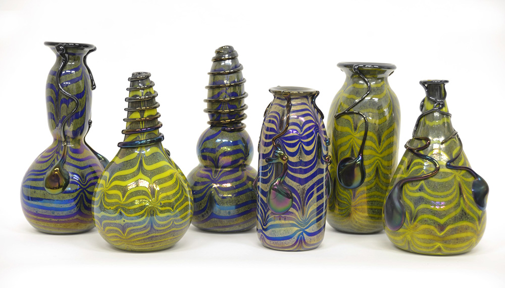 Sergio Rossi (Genova 1950) Gruppo di sei vasi in vetro soffiato a decoro fenicio nei toni del giallo, del verde e del blu con applicazioni di filamenti iridati. Murano, anni 80/90 (h da cm 31 a cm 25)