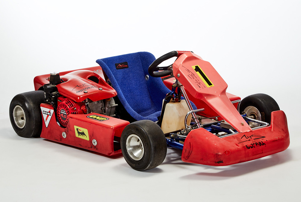 Kart firmato dal pilota di Formula 1 Michael Schumacher e donato al figlio Mick Schumaker nel 2006. Telaio tubolare per bambino, carrozzato in plastica rossa e con decalcomania "Michael Schumaker indoor Kart" applicata sul frontale, sul posteriore e sul vianco della vettura. Firmato a pennarello nero accanto al numero 1. Motore a benzina monocilindrico 4 tempi OHV, raffredamento ad aria, Cilindro in fusione di ghisa, avviamento a strappo (cm 119x164) (lievi difetti) Nota: non si garantisce il funzionamento e la integrità delle parti meccaniche ed elettriche.