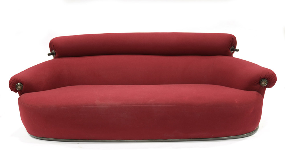 Divano modello "P20B Toro". Produzione Azucena, Milano 1979. Struttura in tondino di ferro verniciato e legno, rivestimento in panno di lana rosso (cm 210x82x103,5) (difetti)