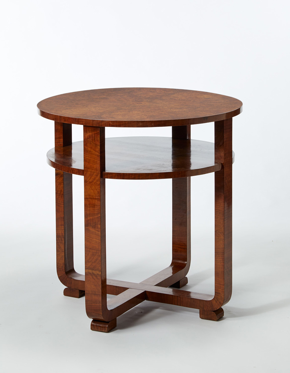 Tavolino "Novecento", impiallacciato in radica con doppio ripiano circolare. Italia, anni 30 (d cm 75, h cm 77) (lievi difetti)