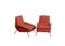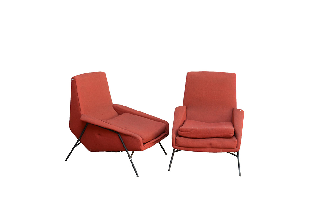 Coppia di poltrone imbottite con struttura in tubolare metallico laccato nero, rivestimento in tessuto rosso. Italia, anni 60 (cm 71x85x83) (difetti)