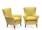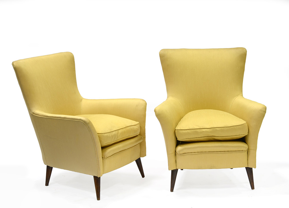 Coppia di poltrone imbottite in tessuto giallo con gambe tronco-coniche in legno. Italia, anni 50 (cm 70x85x60) (lievi difetti)
