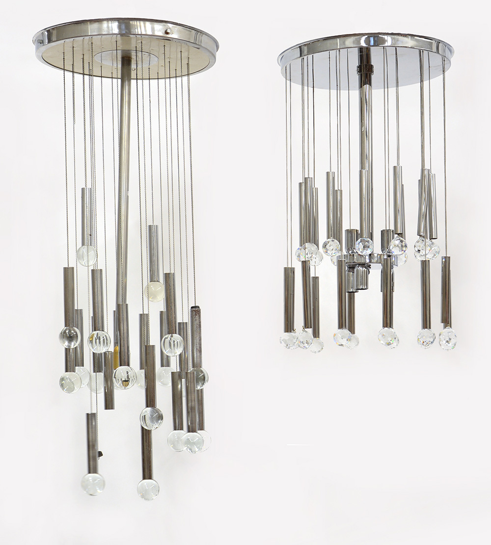 Gaetano Sciolari (1927 - 1994) Lotto di due lampade a sospensione in acciaio cromato con pendenti a sfere di vetro. Italia, anni 70/80 (difetti)