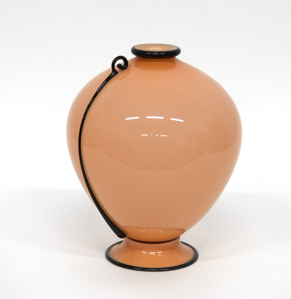 Manifattura di Murano. Vaso in vetro incamiciato color cipria con base, orlo e ansa applicati in pasta vitrea nera. Seconda metà del sec XX (h cm 29)