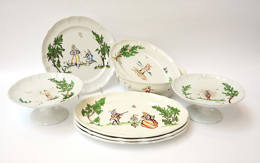 Guido Andlovitz (Trieste 1900 - Grado 1971) Parte di servizio composto da quattro piatti da portata, un'insalatiera, due alzate e un piatto tondo grande della serie "Vecchia Milano" in terraglia decorata con figure di gusto settecentesco in policromia sottovetrina. Società Ceramica Italiana Laveno, Laveno, anni 30 (misure diverse) (lievi difetti) Earthenware part dinner service comprising 4 dishes, 1 sald bowl, two cake stands and a large dish of the series "Vecchia Milano". Società Ceramica Italiana Laveno, Laveno, 1930s (different sizes) (minor defetcs)