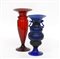 Manifattura di murano. Lotto di due vasi rispettivamente costolato con base applicata in vetro soffiato rosso e biansato in vetro soffiato incamiciato blu con applicazioni di foglia metallica nei toni del verde e base applicata. Seconda metà del sec XX (h max cm 30,5)